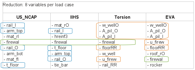 This information may be used to reduce the set of variables for each load case and e.g. perform an optimization afterwards. Here, 8 most important variables are selected for each load case. The colors in the table below visualize the common variables of the load cases. Obviously the variable firewal is important for all four load cases.