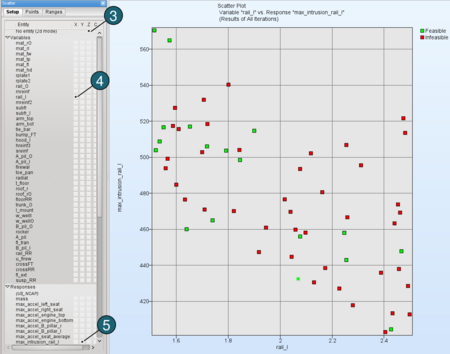 Feasible points are shown in green, infeasible points in red. The Figure shows the correlation between a variable and a response. We could conclude: the bigger the thickness of the variable rail_l (see highlighted in red in the figure below), the smaller is the maximal intrusion of the response max_intrusion_rail_l. The remaining dimensions, that could also have influence on the response, are projected into the plot.