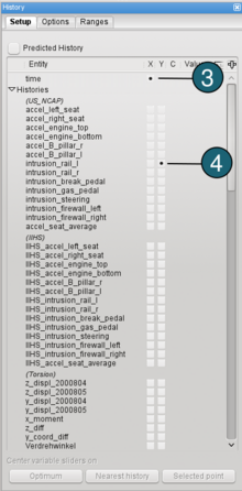 Histories are vectorial output entities of the simulations, e.g. displacement over time curves. Histories may be used to define scalar output entities, e.g. the maximal displacement.