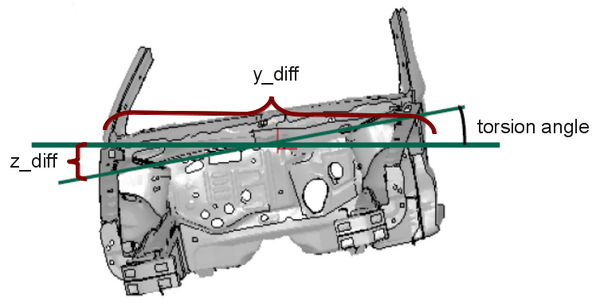 Define the torsion angle: We need to define two expressions before calculating torsion angle. The first one is the difference between the displacements in z direction we defined above (z_diff = z_displ_2000804 - z_displ_2000805). And the second one ist the difference between the coordinates of the displacements in y direction ( y_coord_diff = y_displ_2000804 - y_displ_2000805+1122.4566) The value 1122.4566 is the initial distance between the y coordinates. Now we can define the torsion angle: - From the possible history types select: Expression.